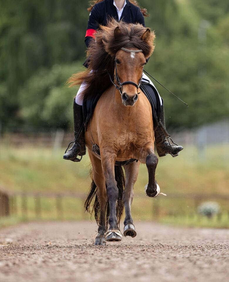 Reiterlich lässt sie keine Wünsche offen: Sie verfügt über sehr schöne, klare Grundgangarten (Galopp noch etwas gelaufen) und bringt viel Talent für Tölt, Fünfgang und Pass mit. Ihr Tölt ist besonders hervorzuheben – taktklar, weich zu sitzen und mit viel Ausdruck. Auch im Zügelüberstreichen zeigt sie sich sicher und motiviert. Sie bringt beste Voraussetzungen für den Sport bis in den Bereich Sport B mit.